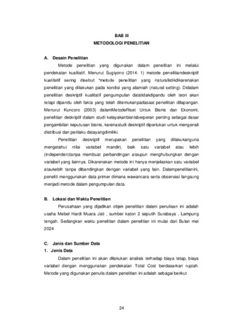 Abstrak Penelitian ini berfokus pada analisis biaya produksi dan perhitungan harga pokok pesanan dalam menentukan harga jual di perusahaan mebel Hardi Muara Jati yang berlokasi di Sumber Katon 2, Seputih Surabaya. Tujuan utama dari penelitian ini adalah untuk mengevaluasi efektivitas metode yang digunakan perusahaan dalam menentukan harga jual produk, dengan fokus pada identifikasi dan analisis biaya-biaya yang terlibat dalam proses produksi. Metodologi yang digunakan melibatkan pengumpulan data melalui wawancara dan pengamatan langsung terhadap proses produksi di perusahaan. Analisis mencakup biaya bahan baku, tenaga kerja, dan overhead, serta bagaimana biaya-biaya tersebut mempengaruhi harga pokok pesanan. Temuan dari penelitian ini mengungkapkan bahwa perhitungan harga pokok pesanan yang diterapkan saat ini tidak sepenuhnya akurat, yang berdampak pada penetapan harga jual yang tidak optimal. Penelitian ini merekomendasikan perbaikan dalam sistem perhitungan biaya produksi dan penetapan harga jual, termasuk penggunaan metode perhitungan yang lebih sistematis dan memperhitungkan faktor-faktor pasar dan margin keuntungan. Dengan implementasi rekomendasi tersebut, diharapkan perusahaan dapat menetapkan harga jual yang lebih kompetitif dan meningkatkan profitabilitasnya. Kata kunci : Analisis biaya produksi, harga pokok pesanan, penetapan harga jual, biaya bahan baku, tenaga kerja, overhead, profitabilitas